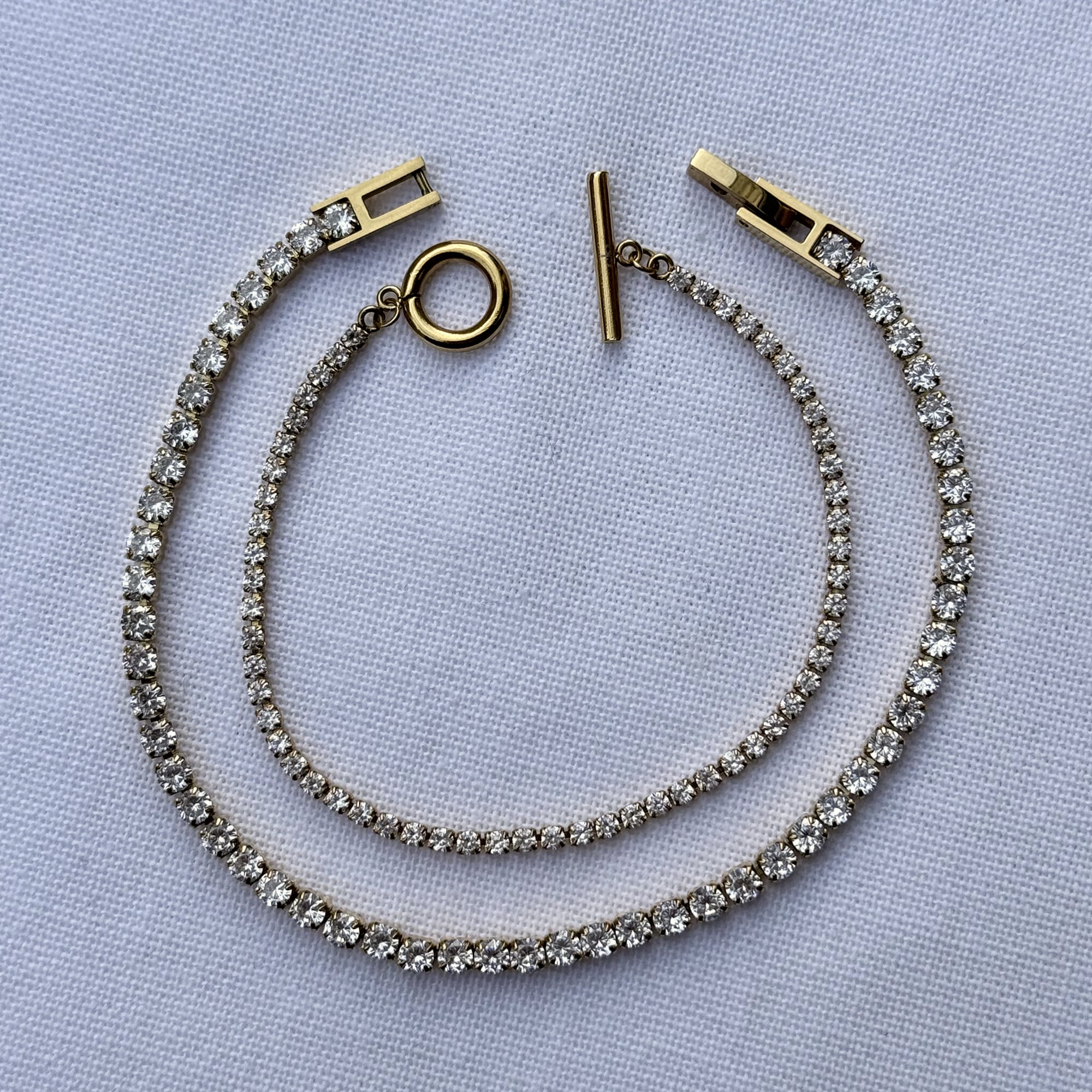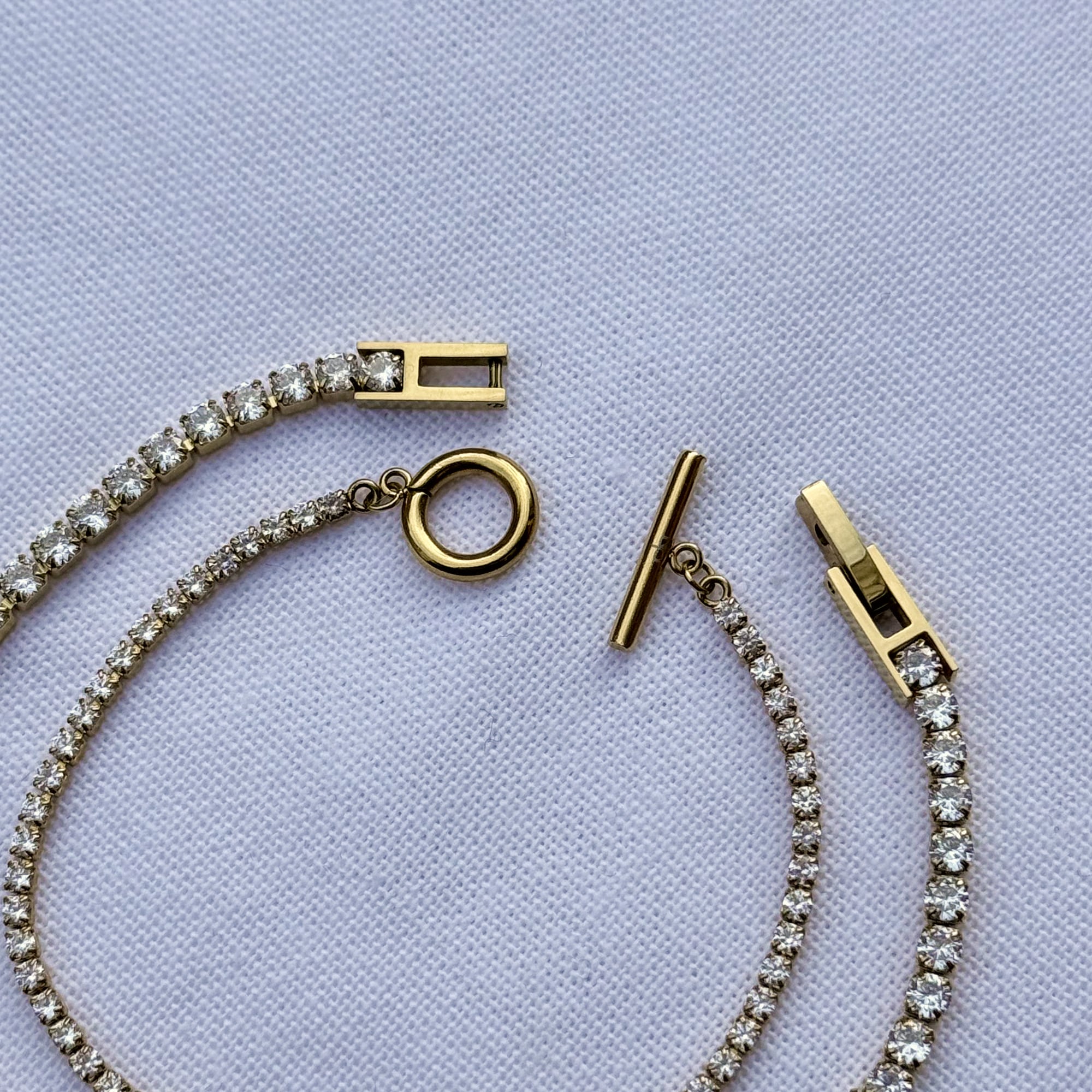 Tennis armbånd 2 mm har i dag en T-lås, som lukkes ved at føre staven gennem ringen og lade den falde på tværs.