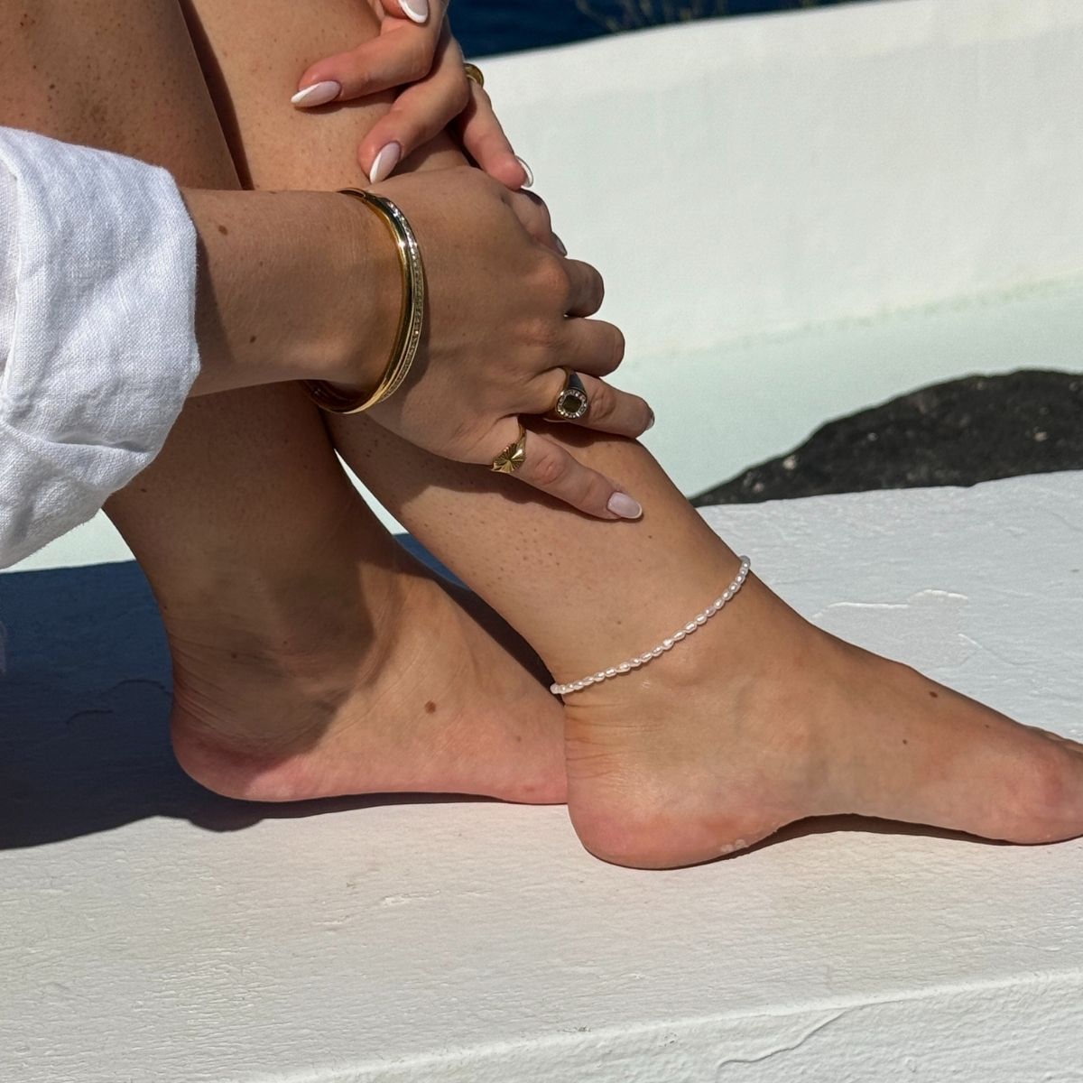 Ankelkæden kombinerer det klassiske udtryk fra ægte ferskvandsperler med et moderne, let design. De små 3 mm perler giver en diskret glans om anklen og tilfører et feminint touch, uanset om du styler den med sandaler, sneakers eller bare tæer i sandet. Et smykke, der emmer af luksus og sommerstemning.
