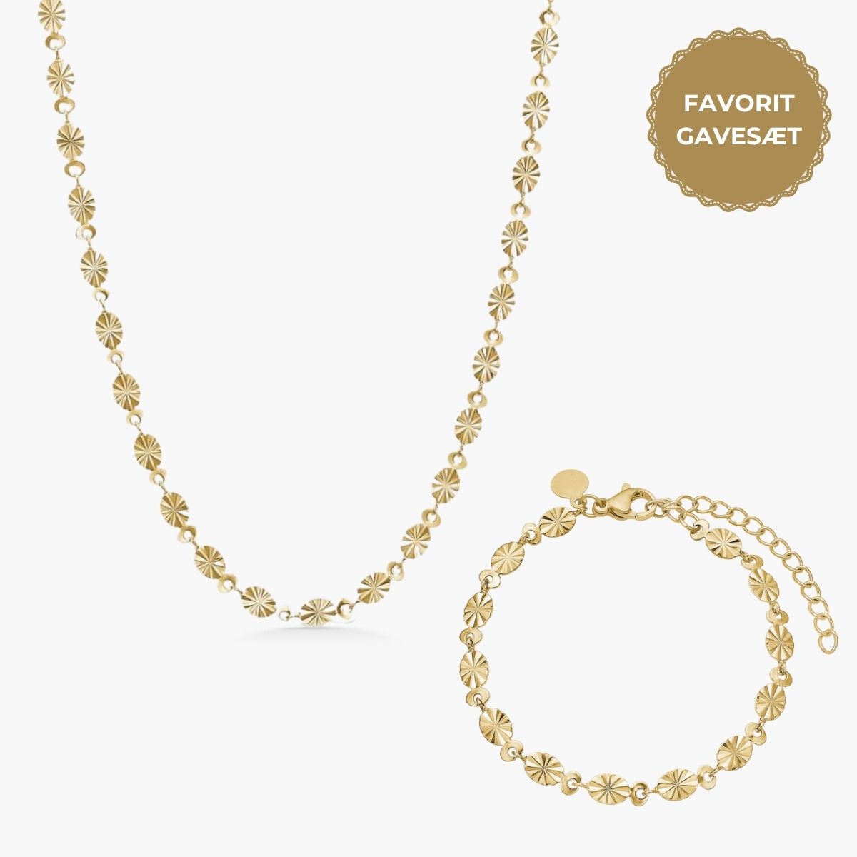 BEDST SOLGTE GAVESÆT - Simpel, men udtryksfuld kæde. Hvert led i kæden har gravering fra midten, som skaber blikfang i solens stråler når den lægger sig om din hals - Style med mit sun kiss armbånd, som funkler om dit håndled.