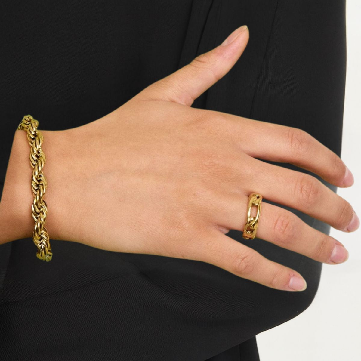 Steel materials coated with PVD techniques are made to withstand most things - their durability means the color doesn't fade as easily as other gold-plated jewelry.