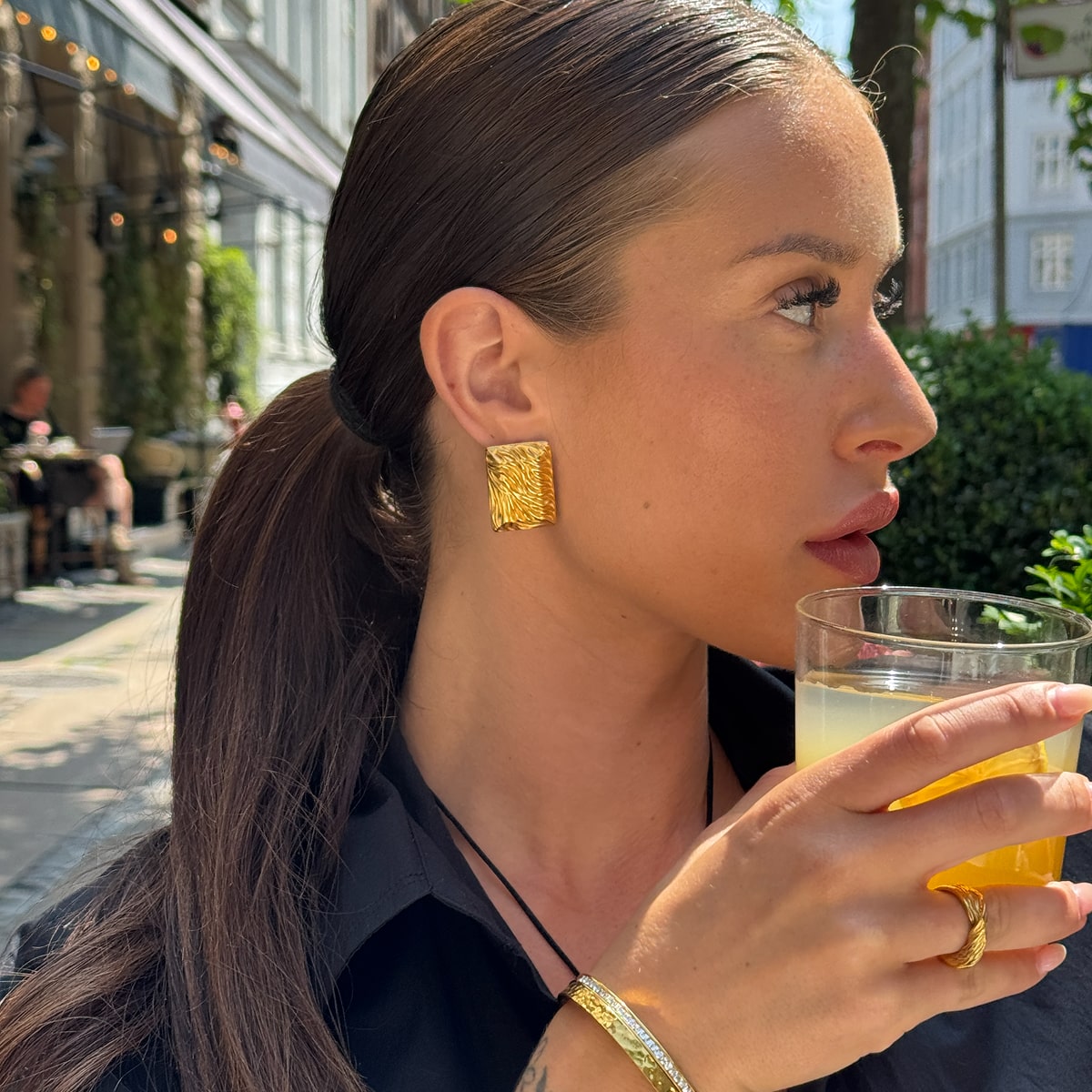 Materiale: Rustfrit Stål forgyldt med 18 karat guld. Smykkerne er nikkelfri og blyfri, jvf. dansk lovgivning. For at forlænge levetiden af dit smykke, anbefaler vi at du er forsigtig omkring hårde overflader.  Ringen måler 6mm høj.