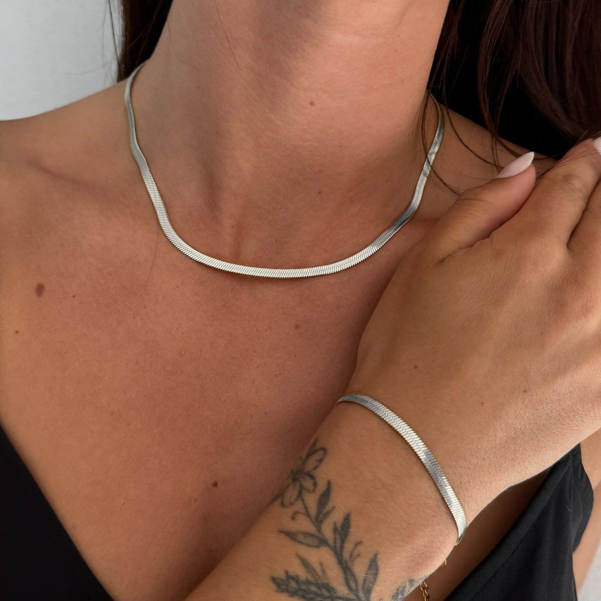 Giv dit armbåndslook nyt liv ved at kombinere den flade slange med elegante bangles. Den flade slange er kendt for sit silkebløde fald og skinnende overflade, og når den styles sammen med strukturerede eller stenbesatte bangles, skaber det et eksklusivt og balanceret udtryk.